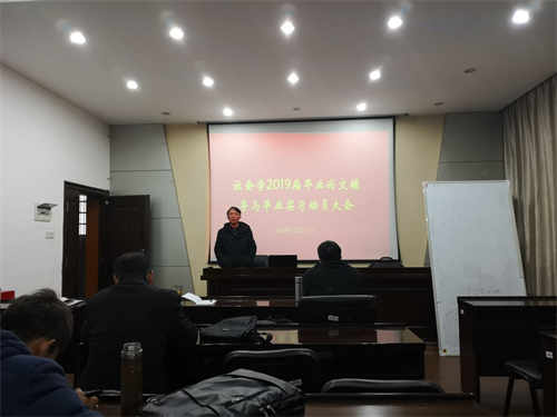 12月11日下午,社会学2019届毕业论文辅导与毕业实习动员大会在升华后楼901室召开。出席大会的有社会学系主任潘泽泉老师,副主任颜敏老师,系教师陈立新老师、雍昕老师以及社会学2015级的全体同学。