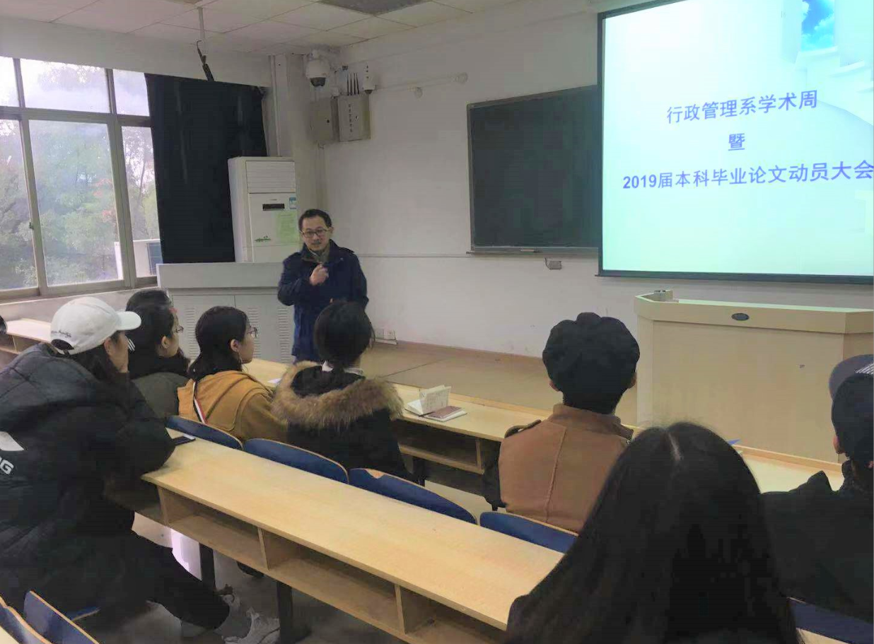 2018年12月26日下午2点,我院2015级行政管理专业在科教北楼301召开了行政管理系学术周暨毕业论文动员大会,行管系副主任李晓飞老师和学工办辅导员梁慧老师参会。会议旨在加强2015级毕业生对毕业论文的重视,以及对毕业论文相关注意事项进行指导,使学生顺利通过毕业论文答辩并产生高质量的论文成果。