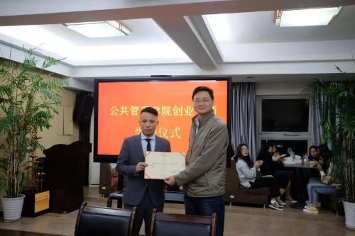 讲座伊始,耿书记向大家介绍了周有贵老师,并宣布周有贵老师受聘成为我们院众创空间的第一位创业导师,随后董院长为周老师颁发“365英国上市集团创业导师”聘书。