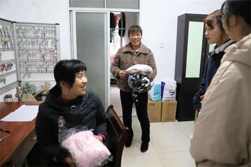 活动开始时,我院分团委青协刘容萍和李淼清同学带着棉帽子、暖手宝等御寒物资,来到升华公寓30栋和31栋宿舍管理室,给宿管和保洁叔叔阿姨送上了亲切的问候和温暖的祝福。之后,两位同学将提前准备好的御寒物资及院内同学们写的明信片分发给叔叔阿姨。收到礼物的叔叔阿姨们脸上洋溢着幸福的笑容。