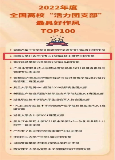 4月23日,我院社会工作专业2020级硕士研究生团支部入选《2022年度全国高校“活力团支部”最具好作风TOP100榜》,被评为全国高校最具好作风“活力团支部”。