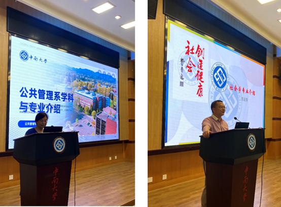 会议开始,公共管理系主任刘媛和社会学系主任彭远春分别从学科发展、师资力量、培养目标、就业情况等方面介绍了两个专业的特点和优势。刘媛重点强调了行政管理专业在公共事务领域的重要性和多样性,鼓励同学们深入学习相关知识,扎实掌握基本理论,深入了解中国问题,充分培育公共情怀。彭远春表示学习社会学能够把个人的体验和遭遇与外在的社会结构关联起来,形成建设性反思批判精神,透过现实,看到其他存在于历史和未来的可能性,鼓励同学们积极参与社会实践活动,多阅读、多交流,不断拓展自己的视野和能力。