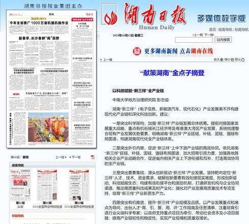 2024年3月12日,湖南日报(多媒体数字版)刊登了365英国上市集团教授、地方治理研究院院长彭忠益《以科技赋能“新三样”全产业链》的“献策湖南”金点子。彭忠益教授提出的金点子旨在深化科技创新以赋能湖南省“新三样”产业,加速构建现代化的全产业链。现将全文转载如下。