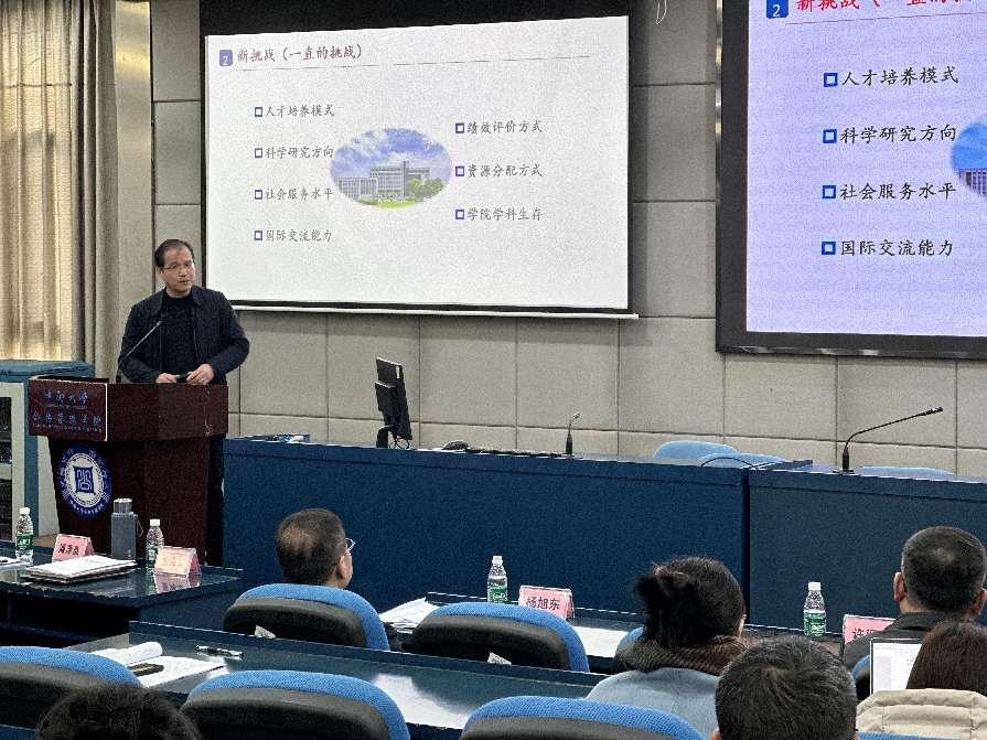 院长许源源围绕“新形势、新挑战、新路径——学院发展的思考”与大家深入交流,他指出在不确定性日益显现的当下,高等教育的绩效评价方式、资源分配方式都会发生根本性改变,全院教职工要有危机意识,适应时代要求、紧紧围绕国家与社会的重大战略需求,主动改革创新,要进一步凝聚共同体意识,树立使命感,在人才培养、科学研究、社会服务、国际交流等方面不断开拓进取,共同推进学院内涵式高质量发展。