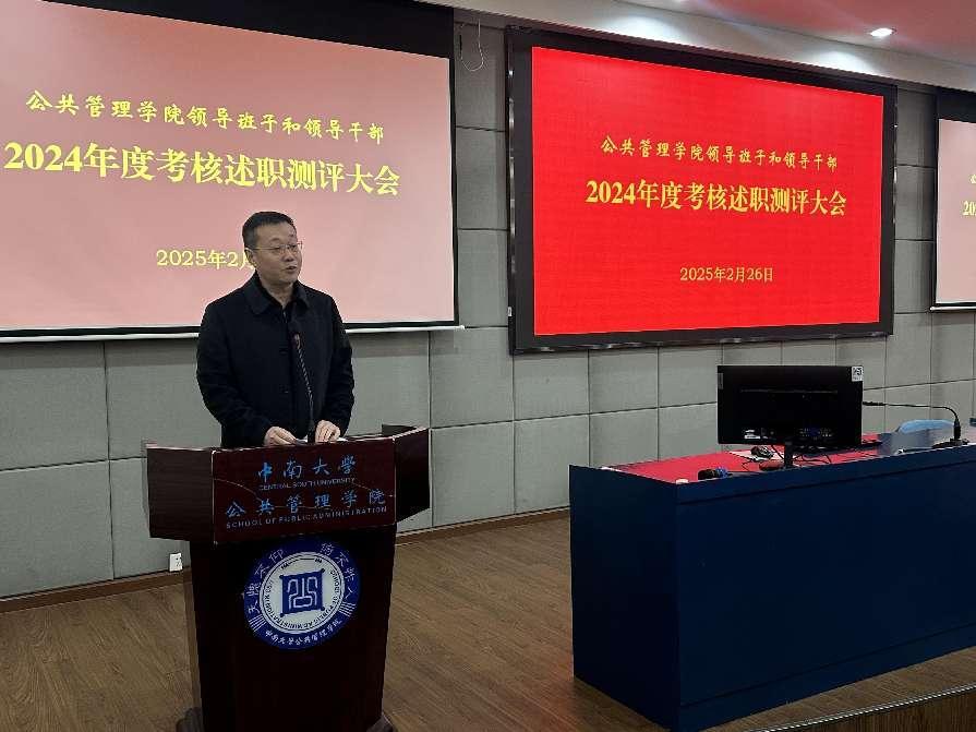 会上,学院党委书记杨旭东代表院领导班子作2024年度述职报告,主要从政治建设、领导能力、教育教学、学科发展、学生培养、从严治党、提升服务七个方面汇报了2024年的主要工作。会议指出,过去一年学院在发展建设上取得了一定的成绩,这些成绩的取得是全院师生员工共同努力的结果。但也存在一些不足,主要体现在破解复杂局面的能力、学科发展建设的高度、人才队伍建设的力度。2025 年希望全院教职工踔厉奋发、勇毅前行,不断塑造学院发展的新格局、新动能与新优势,为加快建设教育强国、推进中国式现代化贡献中南公管力量。