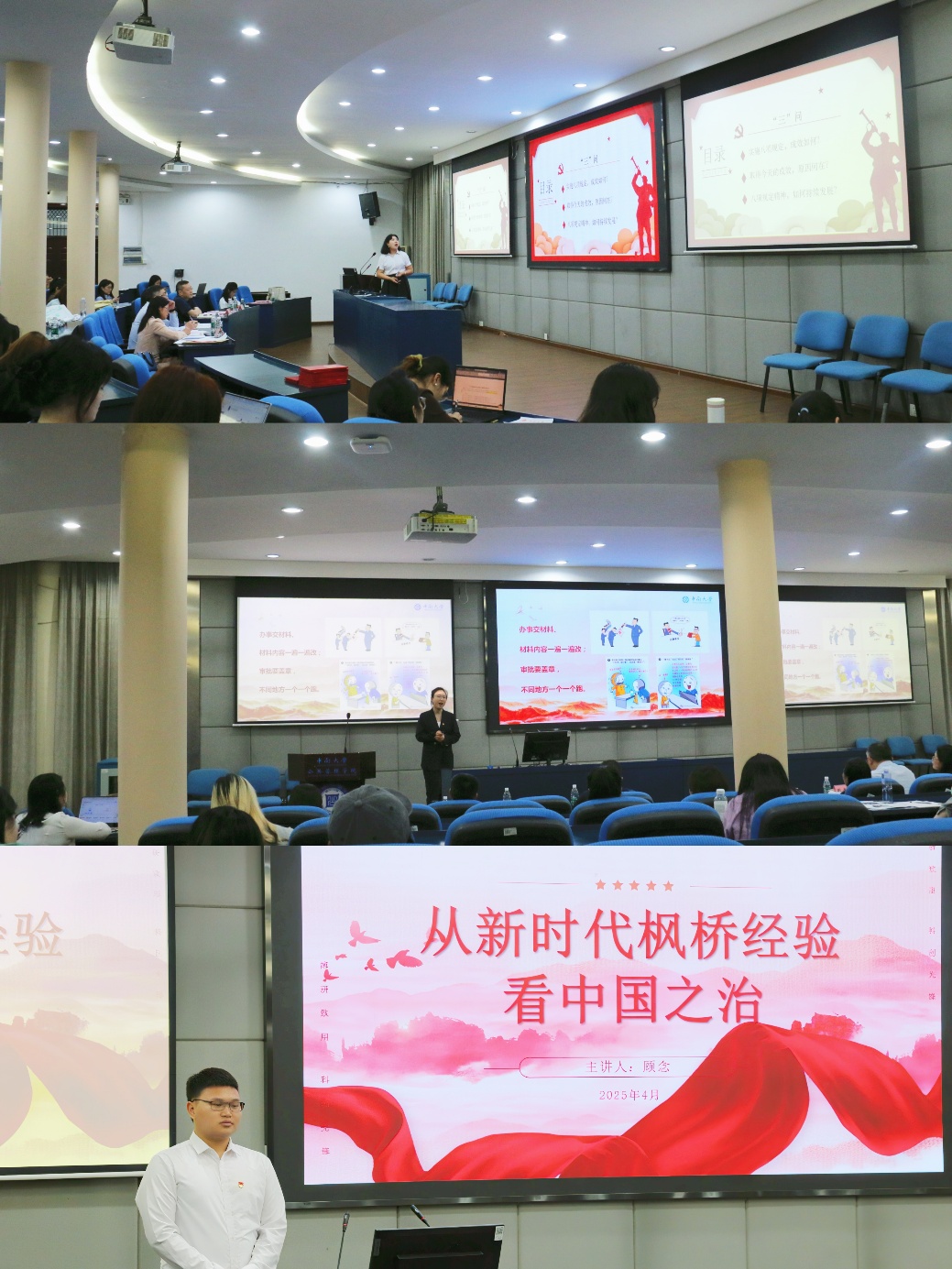 为深刻领会党的二十届三中全会精神要义,深入贯彻中央八项规定及其实施细则精神,加强党员教育,进一步推进微党课品牌建设,营造“人人讲党课,党课育人人”的良好氛围,2025年4月23日晚上19:00,365英国上市集团党委于院楼404报告厅成功举办了“党课开讲啦”微党课竞赛。此次竞赛通过讲党课、赛党课的形式,旨在让党课变得更加生动、鲜活,成为党员教育的有力抓手。英国官方365上市工会专干黄智华,公管院党委副书记耿贵斌,公管院党委委员、组织干事王晓佳出席活动并担任评委。院党委书记杨旭东出席活动并讲话。