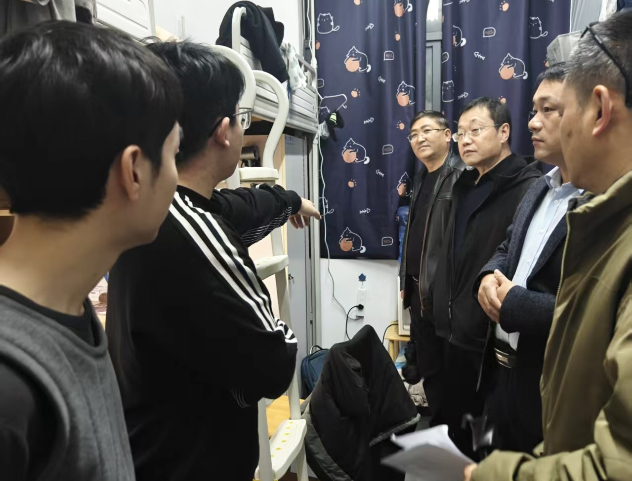 走访过程中,领导老师与同学们面对面亲切交流,详细询问大家的学习进度、生活需求与实际困难,倾听同学们的心声与建议。同时,重点查看了宿舍用电用水规范、消防设施状况及环境卫生情况。针对部分宿舍存在的杂物堆放杂乱、卫生死角未及时清理等细节问题,提醒同学们注意居住细节,引导大家共同维护整洁舒适的宿舍环境;结合冬季传染病高发的特点,叮嘱同学们坚持每日开窗通风,做好室内消杀,养成良好个人卫生习惯,筑牢健康防护屏障。