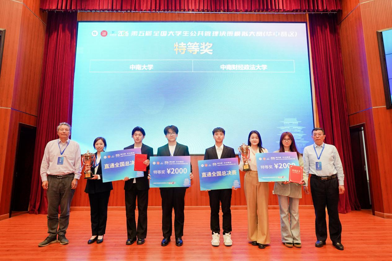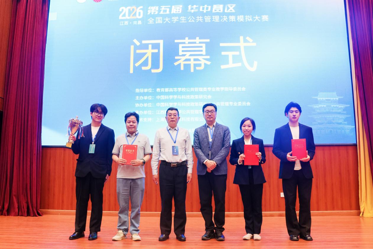 4月18日至19日,第五届全国大学生公共管理决策模拟大赛(华中赛区)在江西财经大学举行。在指导老师欧阳万福、刘媛的悉心指导下,由行政管理专业2023级本科生王松阳、吴铱灵、覃刘一飞组成的“铁道游击队”,以总分第一的成绩荣获华中赛区特等奖,同时摘得“最佳公共管理方案奖”和“最佳团队奖”。