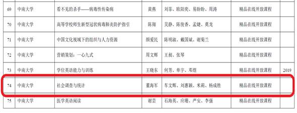 由董海军教授作为主要负责人,车文辉教授、刘惠颖教授、米莉副教授、杨成胜副教授作为团队成员的《社会调查与统计》课程被认定为2020年湖南省一流本科课程精品在线开放课程,是董海军教授团队在2020年获得国家首批线下一流本科课程之后在调查研究方法教学上的又一成绩,争取线下与线上课程建设实践的齐头并进。《社会调查与统计》自2019年年底在中国大学MOOC上线一年多来,受益学生达16000余人,至2020年底使用本课程开设SPOC课程的高校达14所,学习人数998人,跨区域、跨学校推动东中西部高校共享优质课程资源,在深化高校教育教学改革方面取得了显著成效。