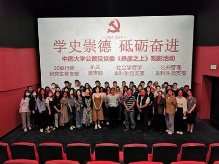 随后,上午9:30,在学院党委书记刘迪老师的带领下,2020级行政管理研究生党支部联合机关党支部、社会学哲学本科生党支部、公共管理本科生党支部3个党支部,共同开展了“学史崇德、砥砺奋进”主题党日活动,前往电影院,观看谍战片《悬崖之上》。