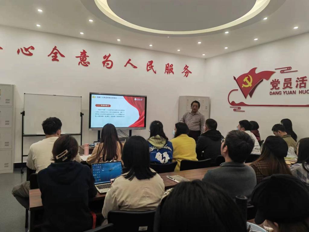 2022年11月25日下午三点,在公管楼310党员活动室,社会学博士生党支部、社会工作硕士生党支部联合组织开展主题为“深入学习宣传贯彻党的二十大精神”的专题党课学习。院党委书记刘迪受邀为两支部党员主讲专题党课,两支部40余名党员参加。