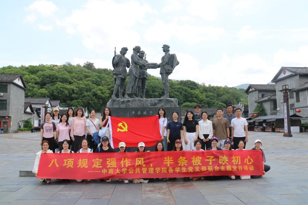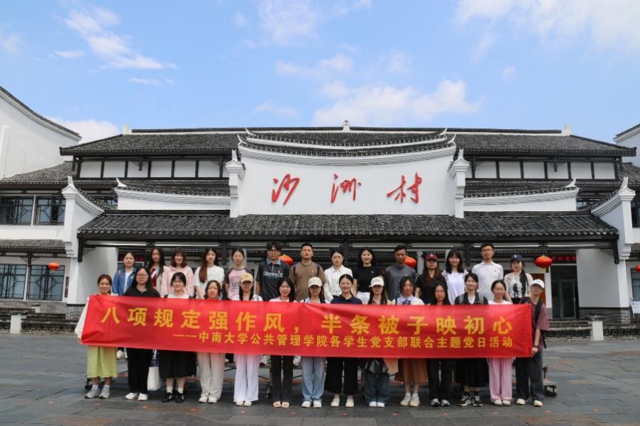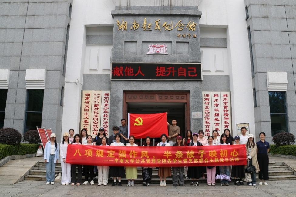 为扎实推进深入贯彻中央八项规定精神学习教育,传承红色基因,厚植为民情怀,增强学生党员的党性修养,5月15日,在学院党委的指导下,学院社会学本科生党支部书记梁慧带领社会学本科生党支部、行政管理本科生党支部、社会学硕士生党支部、公共管理硕士生第三党支部以及村落文化研究生党支部等五个支部学生党员代表,共28人赴湖南省郴州市开展“八项规定强作风,半条被子映初心”主题党日活动,追寻红色记忆,传承革命精神。