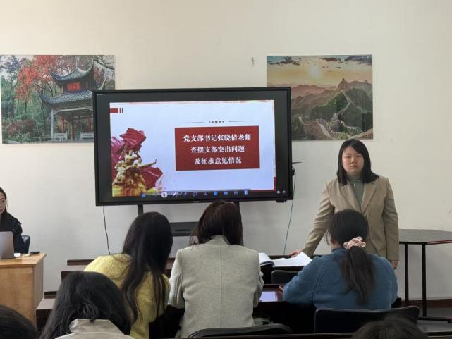 党支部书记张晓倩老师向支部党员传达上级党组织关于查摆突出问题的意见征集情况,围绕“立党为公”“为民造福”“科学决策”“真抓实干”四个方面,重点查摆政治站位与大局意识、宗旨意识与群众路线、民主集中与实际成效、作风形象与长期实效等方面存在的问题,并向党员同志提出了监督与自我监督的要求。她强调,支部将以此次组织生活会为契机,针对查摆出的问题建立整改清单、明确整改时限、压实整改责任,切实把会议成果转化为履职尽责、推动工作的实际行动。