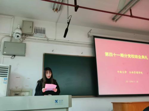 歌毕,闵老师宣布结业情况并对优秀学员标兵、优秀学员进行表彰。第41期积极分子培训班共47名学员,包括本科生24人、研究生23人,47名学员顺利结业。第10期发展对象培训班共34名学员,包括本科生12人,研究生22人,全部顺利结业,培训成果喜人。
