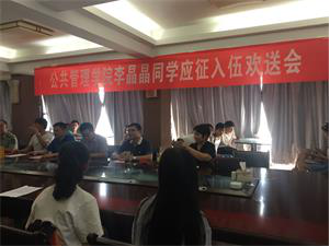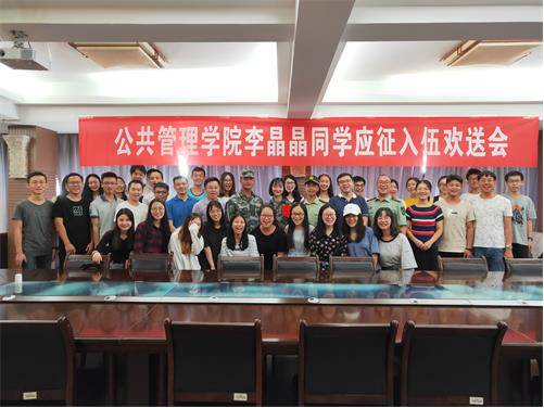 9月21日下午,我院李晶晶同学应征入伍欢送会在升华后楼和谐阁召开。学院姜国俊副院长、周谨平副院长、劳动与社会保障1601班班导师董文琪老师和班级全体同学以及各班学生代表参加欢送会。