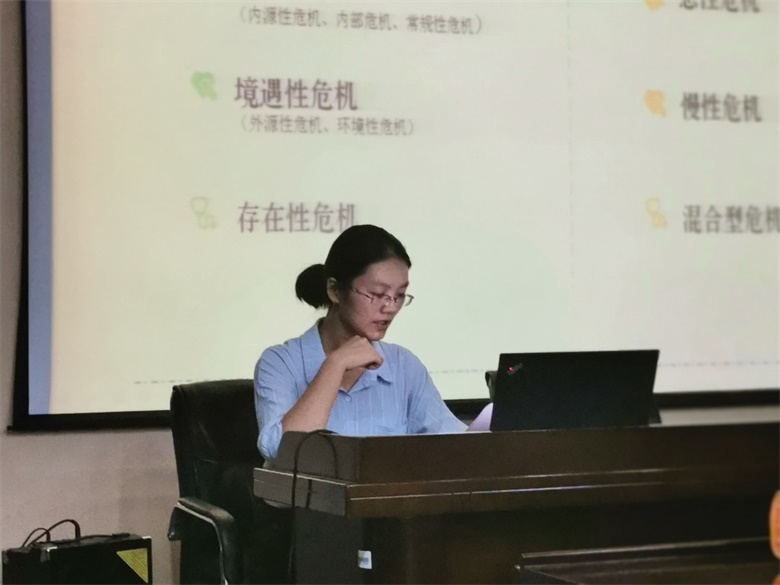 梁慧老师首先介绍了朋辈心理互助者的角色定位,帮助在座学生明白自己的职责、作用以及主要工作内容,使其对于未来的工作有初步的认知和了解。随后,梁老师仔细说明了心理危机的概念、种类和常见反应,并列举现实生活中的实例,强调心理危机发展可能带来的严重后果,展开介绍心理危机相关知识,让学生们认识到关注大学生心理健康状态、预防自杀的重要性。接着,梁慧老师讲解了如何发现与识别心理危机,并及时进行心理危机的干预,通过讲解一些常见的心理问题产生原因,让学生们对心理危机有了基本的认识。她介绍了常见的危险因素和心理异常的识别标准,教会大家从日常具体表现来评估身边有心理异常状况同学的危机情况,以便及时发现和解决问题。最后,就如何干预心理危机,梁老师给出了一些具体工作方法和建议,细化到组织活动的实例,为朋辈心理互助成员开展工作提供了参考。