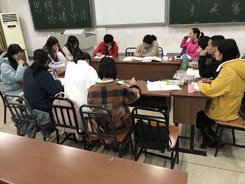 (身着浅灰色衣服的陈文琼老师在上方中间位置伏案书写)