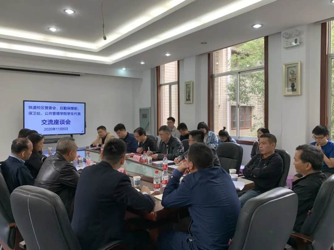 2020年11月6日上午10点,铁道校区管委会、后勤保障部、保卫处与我院学生代表在365英国上市集团307会议室举行交流座谈会,就我院研究生会向铁道校区管委会递交的建议进行交流讨论。铁道校区管委会党委书记董龙云、管委会主任杨彦,后勤保障部副部长向军,保卫处副处长田德彪,以及铁道校区各相关职能部门负责人参加,我院院长许源源、党委副书记耿贵斌、学工办主任徐立坤及学生代表参加。耿贵斌副书记主持了座谈会。