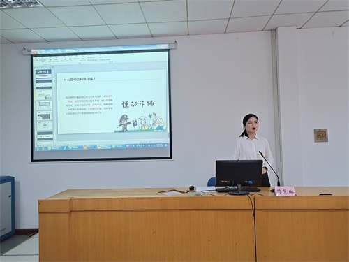 首先,周经理就电信网络诈骗的定义、产业链条、诈骗形式及高发类型作了详细说明,她以真实的案例强调了电信诈骗的危害以及导致被骗的各种心理状态,给出对策及建议,加深同学们对各种类型电信诈骗的认识。她指出,防范电信网络诈骗的“五不要”,即不轻信不明对象的可疑信息、不因贪小利而受违法短信息的诱惑、不拨打短信息中的陌生电话、绝不向任何人提供手机验证码、不泄露个人信息,特别是银行卡信息。