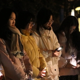 夜幕降临,黑暗中的广场被一片由蜡烛拼成的中国地图与代表国家公祭日时间的数字“12.13”点亮。烛光映照着一张张沉痛的面庞,同学们不畏寒风,手托蜡烛,集体默哀,深痛悼念南京大屠杀中的死难同胞和所有在日本帝国主义侵华战争期间惨遭侵害的死难同胞。