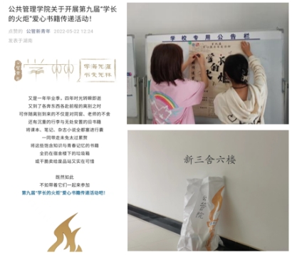 5月16日至5月21日,学院采用线上+线下相结合的方式,加大活动宣传力度,让“学长的火炬”爱心书籍传递活动深入人心。线上方面,通过学院官方微信公众号制作活动推送,并通过QQ群、微信群等渠道积极转发,号召全院本科生、研究生参与书籍传递。线下方面,学工办助理深入我院学生所在各宿舍楼栋内,粘贴活动海报,走访各毕业生宿舍进行“扫楼征书”,重点面向大四、研三毕业生讲解活动意义、发放倡议书和精美书签来进行活动宣传,进一步增强了宣传效果。