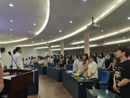 首先,耿贵斌在动员讲话中代表学院2022级新生表示了热烈欢迎,并寄语大家在未来的学习生活中勇立潮头,当先锋,努力提升综合素养,成就辉煌人生。动员讲话结束后,全体成员演唱国歌,高亢洪亮的歌声传递出2022级新生不惧未来,不畏困难的魄力和勇气。