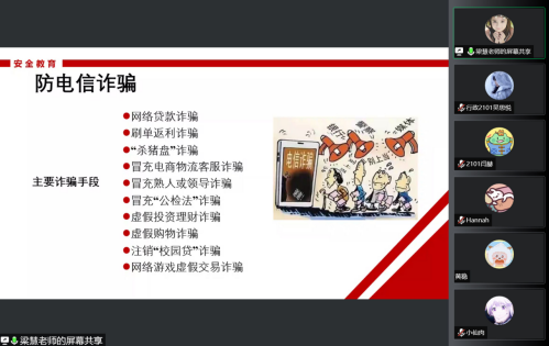 2022年9月28日晚上9时,我院安全教育主题线上年级大会召开。会议由本科生辅导员梁慧主持,我院19级与21级全体本科生参会。会议围绕防电信诈骗、交通安全、食品安全以及用电安全等四个方面对同学们进行提醒和要求。