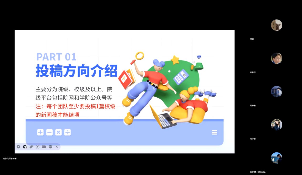 会议伊始,明确投稿内容和投稿方向。主持人梳理了多样化投稿渠道并分析了各个渠道的特色,同时,学院融媒体宣传中心负责人详细讲解了推送格式要求和新闻稿件规范,为各团队自主进行实践宣传提供了参考和建议。