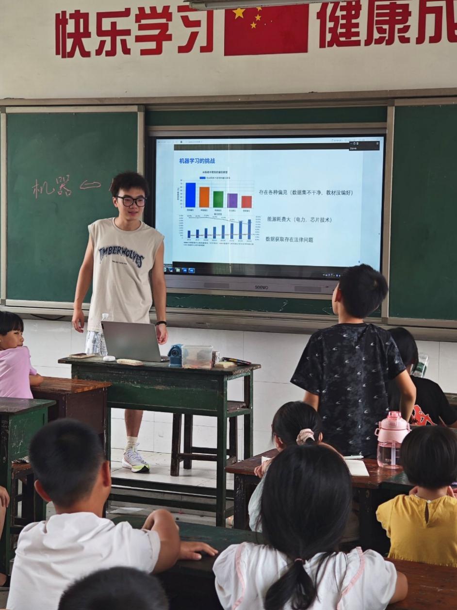 支教准备阶段,团队结合14名成员的专业背景,精心设计了七大类课程体系,兼顾基础知识与科技启蒙。在AI科普特色课程中,支教老师用通俗易懂的语言讲解AI原理,鼓励同学们发挥想象力,设计未来的人工智能,在互动体验中揭开科技的神秘面纱。在针对乡村儿童网络使用安全与素养开设的网络素质课程中,老师们教授辨别网络谣言、合理利用网络的实用技巧,引导孩子们树立健康的网络使用观念。
