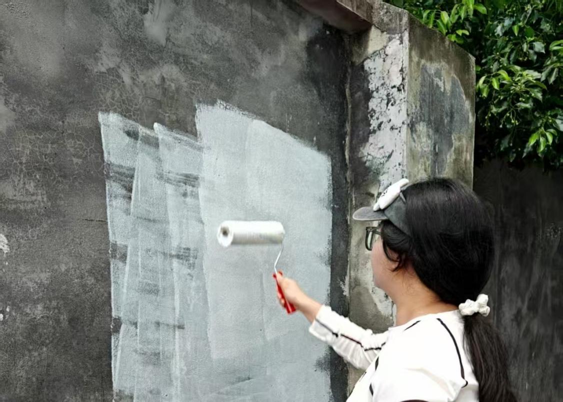 由于选定的墙面是水泥墙,7月31日至8月1日,实践团紧锣密鼓地开展了墙面前期处理。团队指导老师梁慧老师带领大学生志愿者共同清除陈年污渍,仔细、均匀地为墙面刷上三遍洁白的底漆,墙面焕然一新。