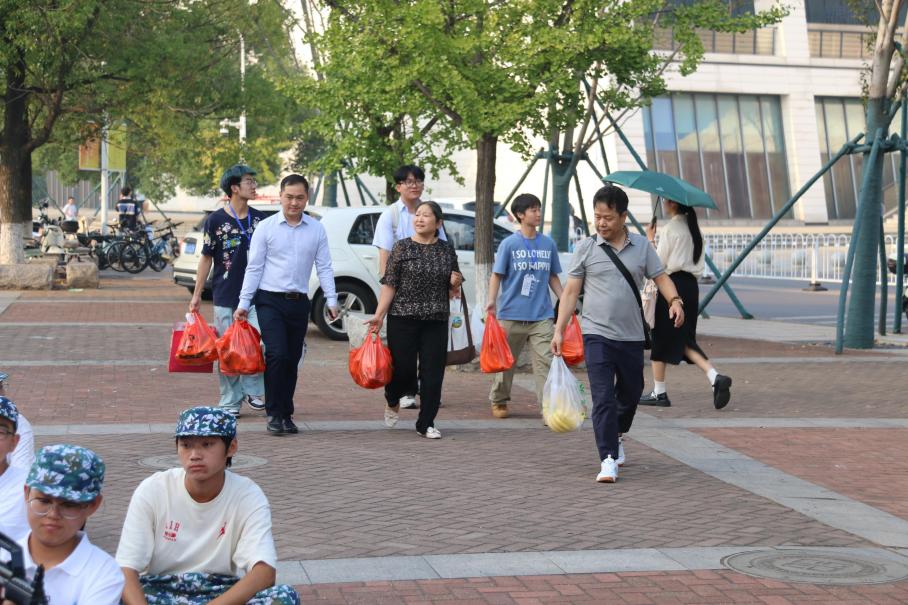 训练间隙,各位老师为同学们准备了零食与香蕉等慰问品,叮嘱大家要科学训练,注意休息;并与在场的学长学姐们进行了交流,详细了解了新生军训适应工作的开展情况。同时,老师也对教官付出的辛勤劳动表示诚挚感谢,并对同学们展现出的训练成果表示肯定。