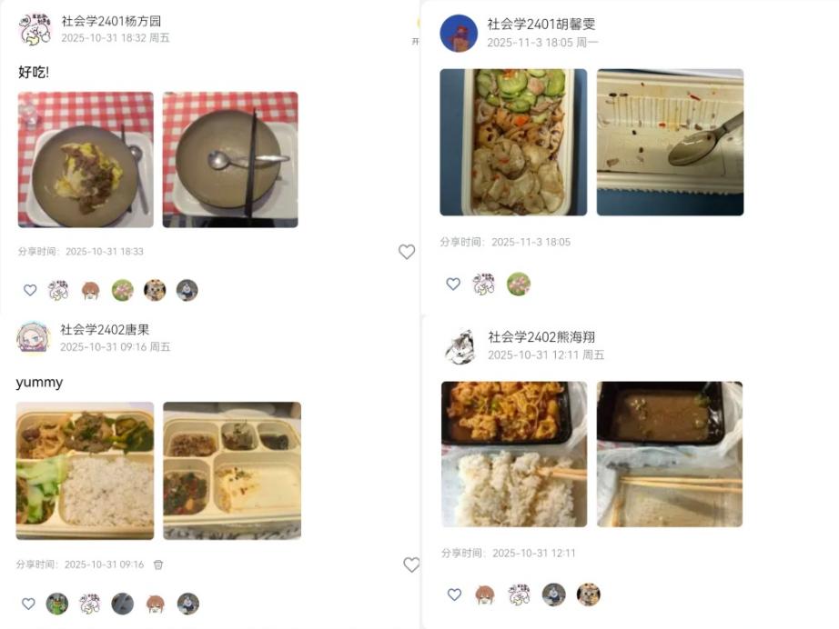 本次团日活动创新形式,依托小程序平台,组织两班同学以每日打卡的方式,上传每餐“光盘”照片,记录并分享节约实践。期间,同学们认真践行光盘行动,踊跃分享节约成果。其中,杨方园、胡馨雯、何颖等同学分享“光盘”次数超7次,两班总计打卡分享次数186次。在持续的打卡互动中,不仅强化了同学们的个人节约习惯,也在班级间营造了“爱粮节粮、人人有责”的良好氛围。