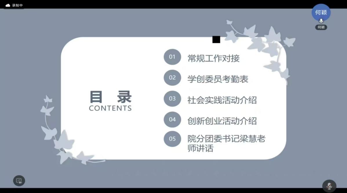 为规范学习(双创)委员工作内容,促进学生社会实践与创新创业,11月1日晚7时,我院举办2025年学习(双创)委员线上培训会,学院分团委书记梁慧出席,全体本科班级学习(双创)委员参加。会议由院分团委科创实践部部长何颖主持。