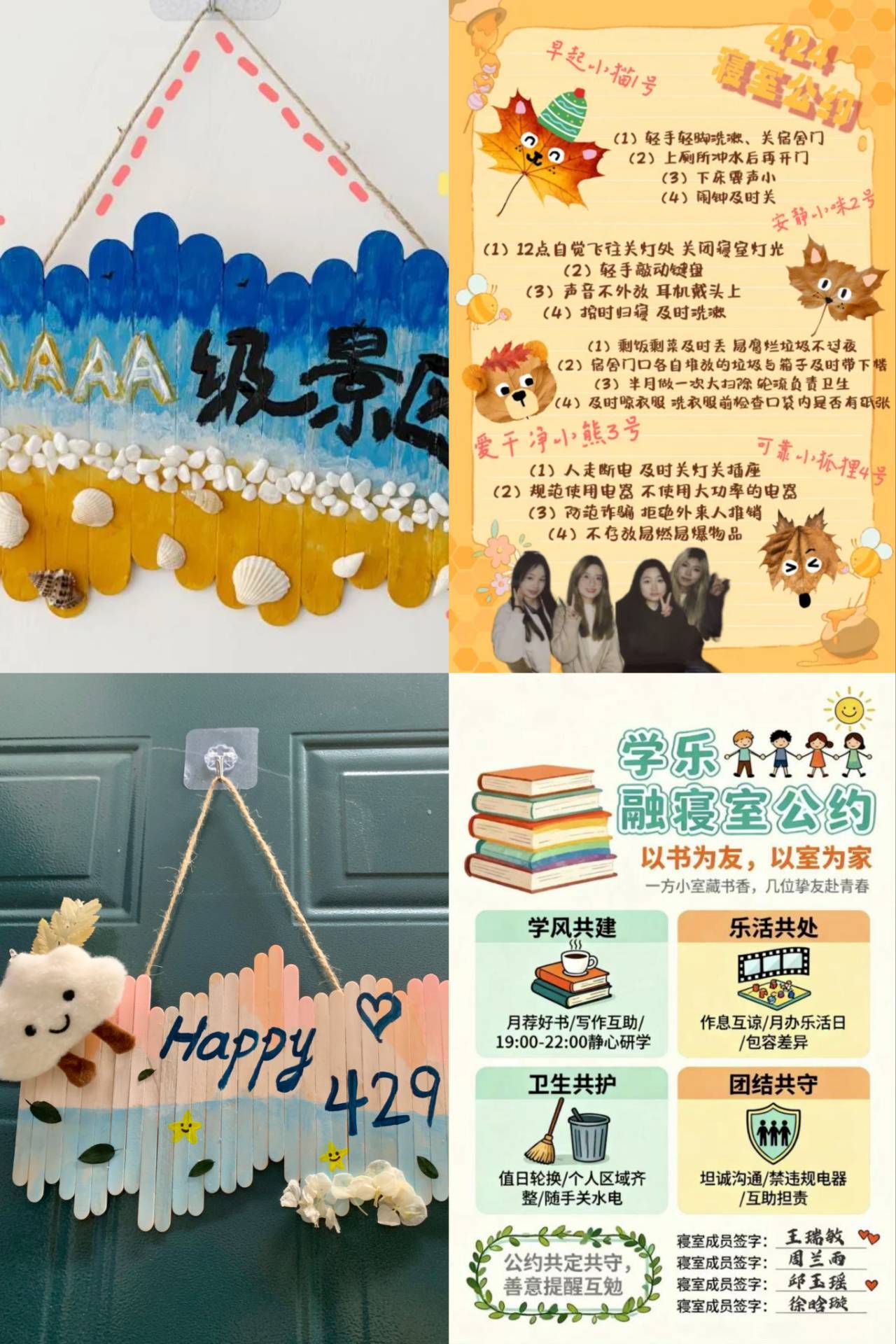“寓我同行”门牌DIY暨公约共创活动共有37个寝室积极响应。同学们充分发挥创意才智,自主设计兼具个性特色与集体记忆的寝室门牌;围绕作息规范、卫生维护、学风建设、安全防范等核心内容,共同商议制定寝室公约,将个人诉求与集体利益有机结合,形成“一人倡议、全员讨论、共同遵守”的自治氛围。