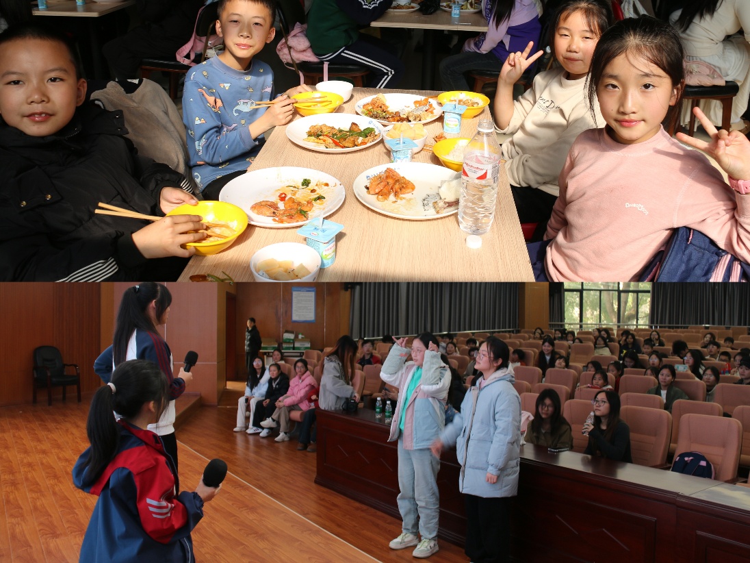 随后,大中小学师生集体前往天心校区六食堂用餐,并在梅园报告厅稍作休整。期间,大学生志愿者与中、小学学生开展“你来比划我来猜”的趣味互动游戏以及才艺表演,通过轻松的团体游戏,拉近了彼此距离,现场气氛活跃融洽。