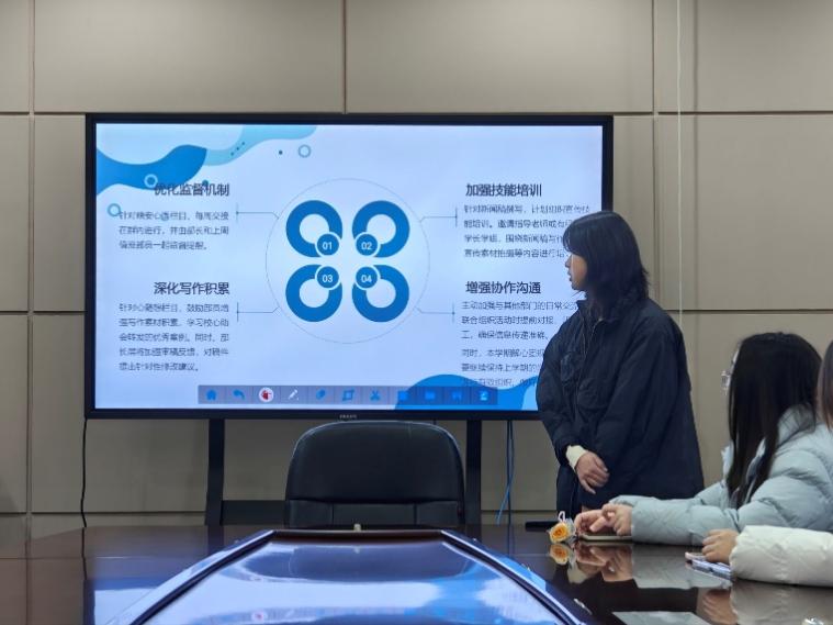 会议伊始,各部门依次汇报新学期工作思路:办公室将优化流程与考勤管理,强化内部培训;组策部聚焦策划的创意性与现场执行力;宣传部着力提升文案质量,推进原创内容;心研部完善成员关怀机制,调整解心团制度,规范“心随想”栏目内容。