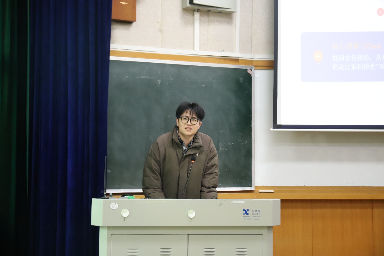 活动伊始,林海洋从“用环境讲故事”切入,结合学院新闻网典型案例,系统讲解了会议、风景、活动等不同场景下的拍摄要点。同时,他通过校园全景、建筑局部与细节特写等实例,分析了远景、中景、特写在不同场景下的应用方法,并从设备检查、提前踩点、人物拍摄禁忌等方面分享了摄影实操规范。