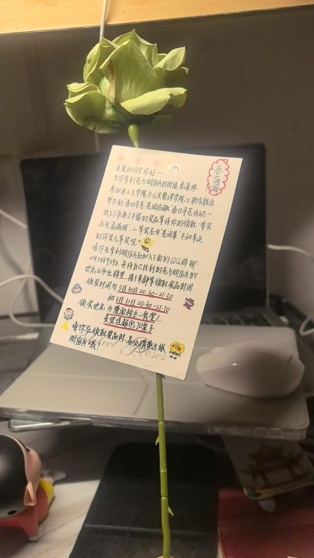 本次活动以趣味解谜、春日寻花为核心形式。活动前期,两院心助会通过海报、推送等多渠道宣传,精心设计藏花谜题,充分调动两院同学们的参与热情。活动开展期间,同学们循着谜题线索探寻校园藏花点位,成功找到春日鲜花与定制祝福明信片,凭找到的卡片兑换精美礼品。