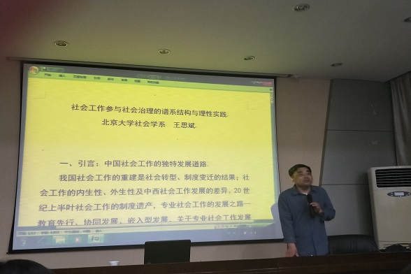 4月12日晚7点在升华后楼901教室,我国著名社会学家、社会工作学专家、中国社会工作教育协会会长、北京大学博士生导师王思斌教授应邀来我院做题为“社会工作参与社会治理的谱系结构与理性实践”的学术讲座,讲座由我院副院长李斌教授主持。我院社会学系系主任潘泽泉教授、董海军教授、硕士研究生及本科生100余人聆听了此次讲座。长沙其他院校的社会工作专业老师、学生及对社会工作感兴趣的社会人士也闻讯而来。