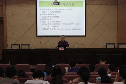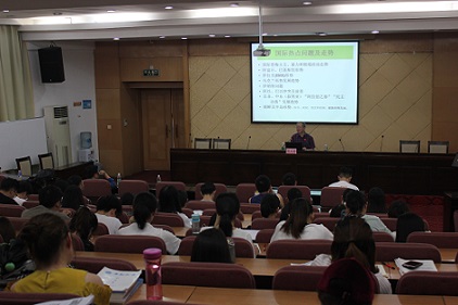 楚教授介绍了国际热点问题及走势,针对朝鲜及半岛形势重点提出了自己的观点,同时也介绍了中国外交和安全总体形势。他认为我国目前可谓外交无敌国、无全面对立对抗国家,综合实力、国际地位、作用和影响呈上升趋势;楚教授指出,当前世界的贸易战未能影响我国的经济,但是科技战对我国的发展造成了阻碍,并例举了好几个实例来说明这一问题。