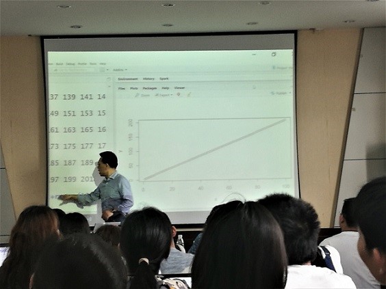在此次报告中,陈定庚教授深入浅出的向大家介绍了R语言的下载、安装、统计与作图功能及在科研工作中的应用方向,并结合现场演示帮助大家加深理解,并于此次课程中涵盖使用r的高级统计建模和计算,回顾连续数据的多元线性回归,二元/二项式数据的logistic回归,涉及纵向数据分析和一般多层次建模等等丰富实用的内容,其专业扎实的技术水平、清晰而富有感染力的分享教学方式获得了场内学子们的掌声。