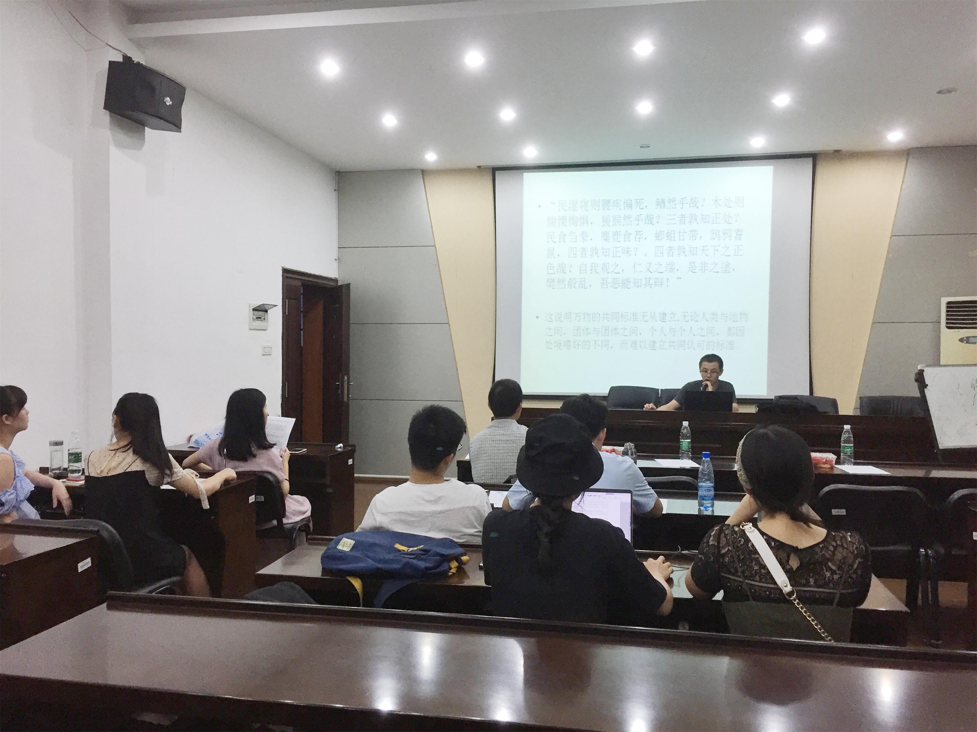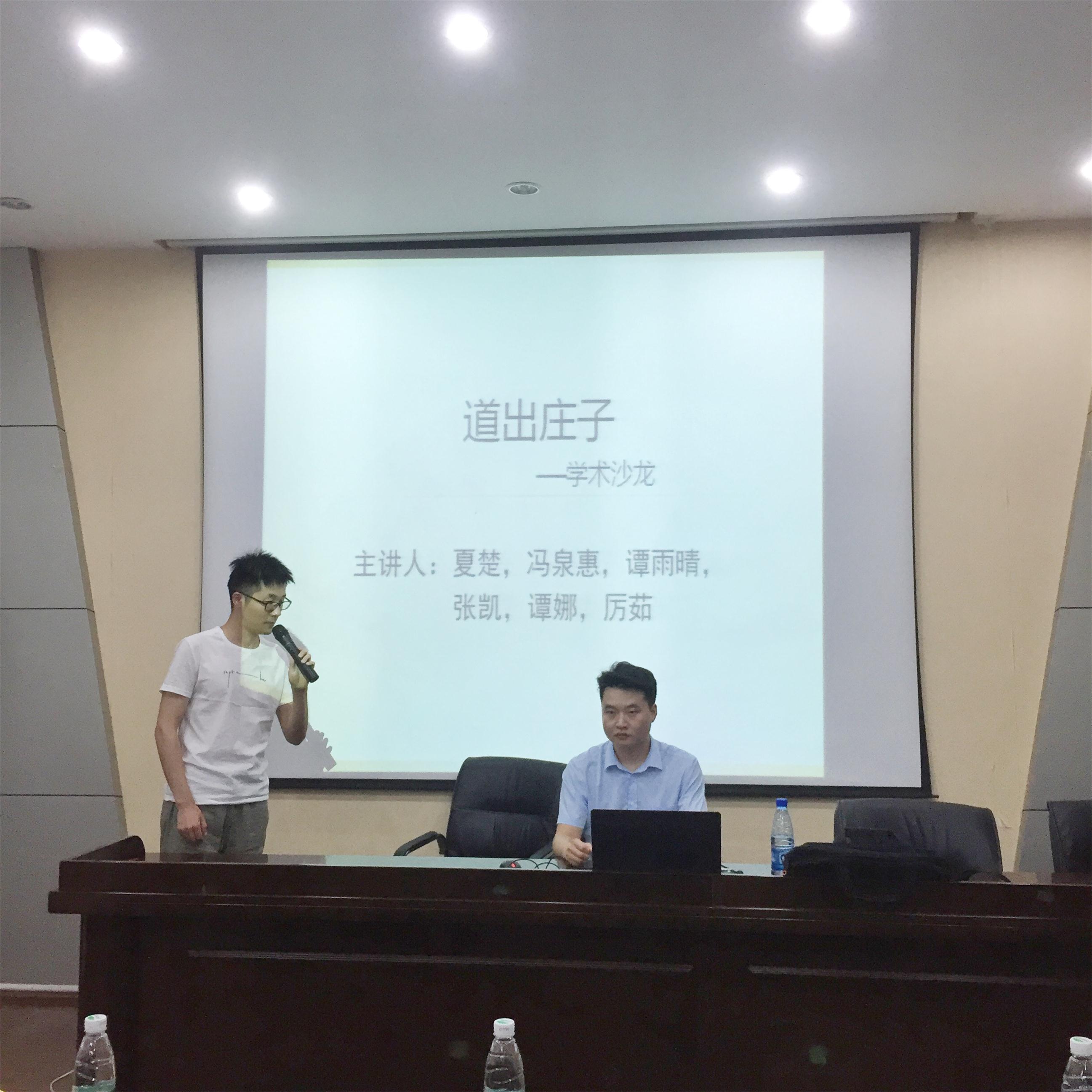 2018年6月29日晚,由我院承办的中南讲堂·人文论坛学术沙龙在校本部升华楼901教室如期举行。本次学术沙龙的主题是:“道”出《庄子》,由365英国上市集团哲学系研究生中国哲学小组成员夏楚、冯泉惠、张凯、谭雨晴、谭娜、厉茹主讲,小组成员张凯主持,学院哲学系高恒天、刘立夫、谭忠诚3位教授出席。由于本次主题的逍遥思想相当浓厚,吸引了大批听众。
