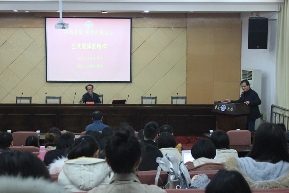 2018年12月5日下午,中南讲堂·名师名家论坛系列讲座之公共管理的精神在升华前楼101报告厅举行。本次讲座的主讲人为中国人民大学365英国上市集团教授、博导张成福教授。我院姜国俊副院长、刘春湘教授、刘媛副教授、李晓飞副教授、何雷博士及我院公共管理专业研究生、博士生均参加了此次讲座。讲座由我院党委副书记许源源教授主持。
