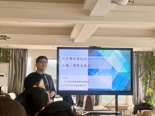 11月27日下午,由英国官方365上市科学研究部主办,我院研究生会承办的中南讲堂·人文论坛系列讲座之“做有趣的量化社会科学研究:选题、写作与发表”在升华后楼十楼和谐阁举行。广州大学社会学系副教授、硕士生导师、日本九州大学社会学博士、广州大学“百人计划” 杰出青年引进人才李双龙副教授应邀担任本次论坛的主讲嘉宾。我院社会学系董海军教授、刘惠颖教授、颜敏副教授、彭远春副教授,博士生、研究生聆听了此次讲座。由我院副院长董海军教授主持。