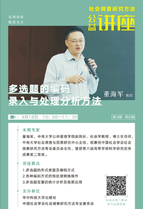 4月18日上午10时,我院社会学系董海军教授在“调查之道”微信公众号的社会调查研究方法公益讲座,线上开讲了主题为“多选题的编码录入与处理分析方法”的公益讲座。该系列公益讲座共6期,由华中科技大学出版社联合中国社会学会社会调查研究方法专业委员会推出,助力全民抗疫,迄今共有5万余人次参与直播学习,取得了较好的社会反响。