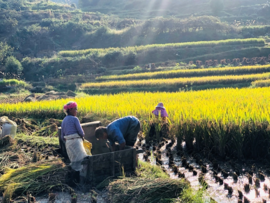 会后,与会代表参加了归与书院优质稻米收割仪式。今年年初,湖南松柏农业科技有限公司在归与书院的大力引荐下,与书院周边的瑶汉两族村民一起试种了“原种原种”生态有机稻米,并以远高于市场价格的每斤五元的保底价格签订了稻谷回收协议。归与书院在今年5月份专门举行了瑶汉两族同胞参与的插秧仪式,当时有来自北京、长沙、邵阳等地的与会嘉宾参与了插秧活动。