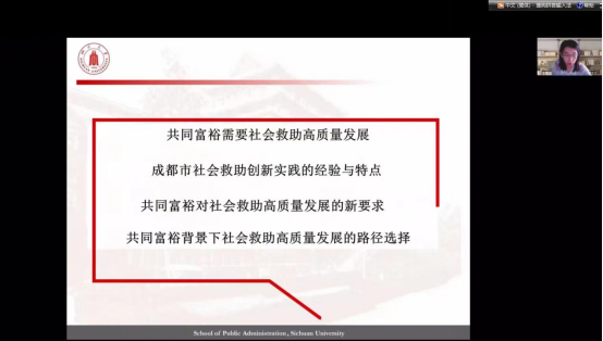 张浩淼教授以共同富裕的视角和社会大救助的理念,围绕着共同富裕背景下社会救助高质量发展的必要性、成都市社会救助创新实践的经验与特点、共同富裕对社会救助高质量发展的新要求、以及社会救助高质量发展的路径选择等问题展开分享。张教授提出,在当今中国共同富裕背景下,我国社会大救助事业,应实现救助对象识别标准从单一向多维转变;救助需求从济贫向助困转变;救助水平从生存向发展转变;救助服务递送方式从碎片向整合转变。同时介绍了成都市推行的“政府救助+关爱援助”的救助体系、“基础工作+特色项目”的救助方式、“政府主导+多元参与”的救助主体、“智慧平台+社会救助”的救助模式等社会大救助创新经验。并建议建构以生活弱势群体和生活困难群体需求为导向、协调整合社会救助资源、采用智慧救助和服务救助手段,构建以政府为主导、多元主体共同参与的社会大救助治理新格局。