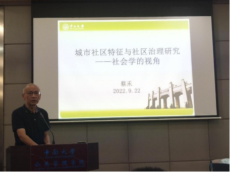 2022年9月28日上午10时,中山大学社会学系教授、博士生导师蔡禾教授受邀在我院院楼404室,进行了主题为“城市社区特征与社区治理研究——社会学的视角”的讲座。我院50余名研究生到场参与此次讲座,本次讲座由我院副院长董海军教授主持。