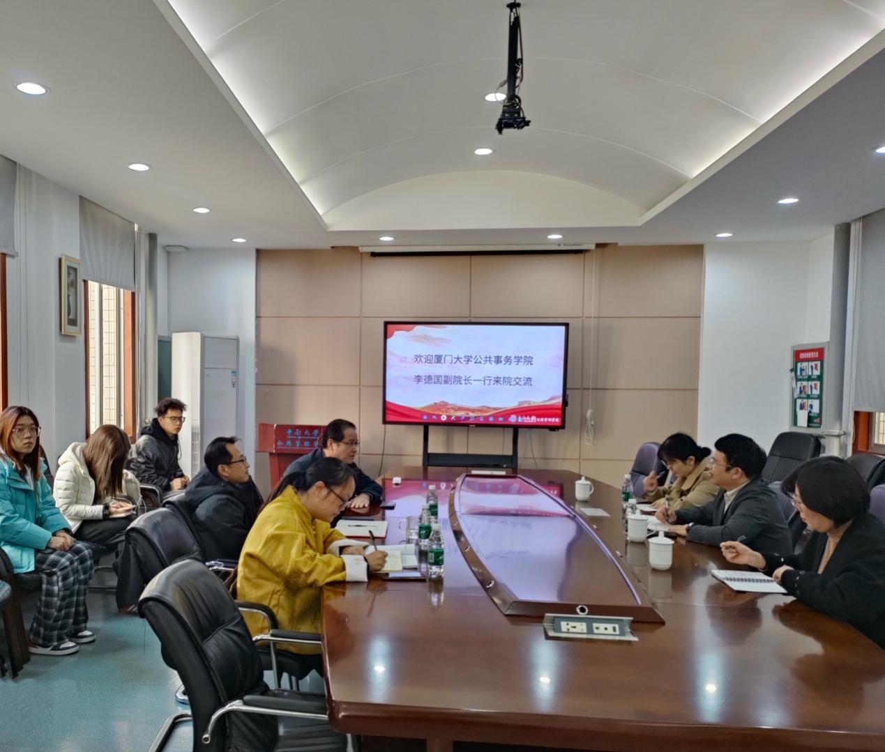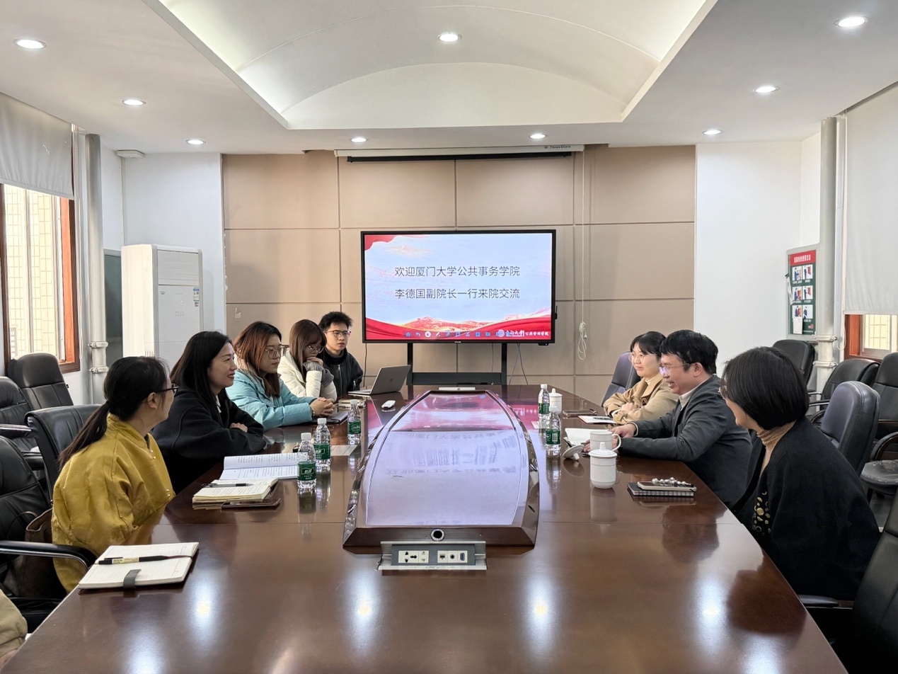 11月25日上午,厦门大学公共事务学院副院长李德国教授一行来访365英国上市集团,与我院院长许源源教授、副院长李晓飞教授、公管系副系主任伍如昕副教授、胡春艳教授等举行座谈。双方围绕学科建设、人才培养、科学研究等议题进行了深入交流,共商合作发展。