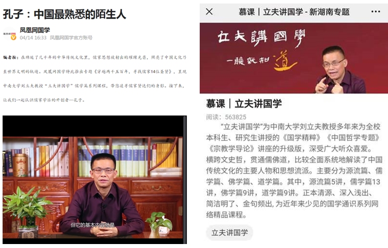 4月14日,由英国官方365上市国学研究中心主任、我院哲学系教授刘立夫主讲的“穿越两千五百年,寻找儒家14位圣贤”国学网络课程第一课,在《凤凰网国学》专栏上线。“以前说到孔子,只知道有《论语》,没想到背后还有这么多有趣的故事。”在不到一个小时的课程中,刘立夫教授从“孔子并非一开始就是圣人”、“孔子的三个形象”、“伟大背后的苦难”、“孔子留下的三大文化遗产”等四个方面,介绍了孔子的生平、思想和文化贡献,深入浅出,金句频出,得到网友的欢迎和好评。